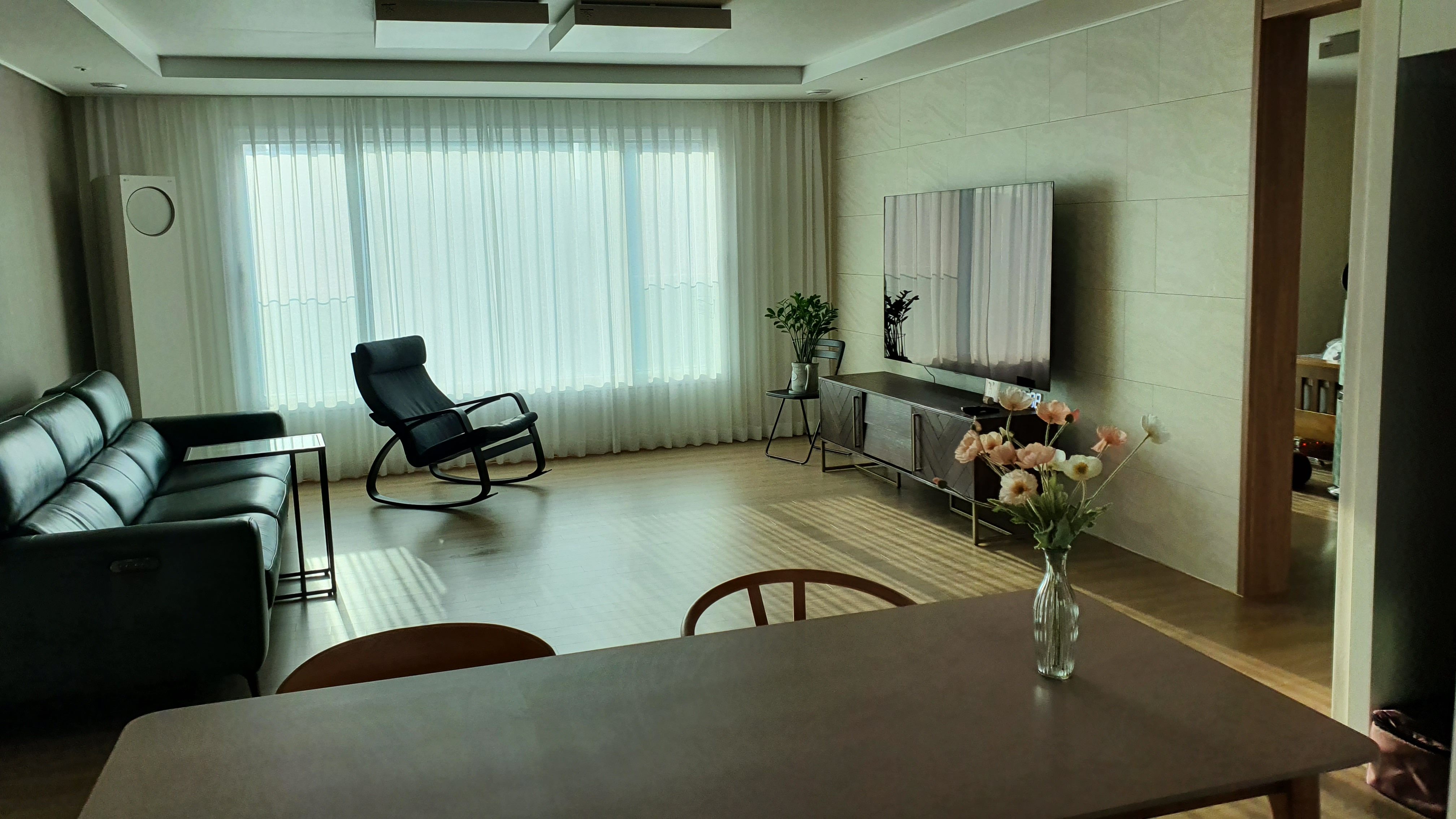 OLED 77인치 TV를 이미 구입하고 나서 녹색 소파(까사미아 뉴로건 4인 리클라이너), 거실 테이블을 따로 두지 않고 TV 밑에 플스와 여러 잡동사니를 정리할 헤링본 무늬가 두드러지는 거실장(까사미아 헤링본 AV) , 소파를 이용할 때 간단하게 음료를 두고 활용할 수 있는 유리 테이블(이케아 빗셰 노트북 스탠드)로 꾸민 우리 거실은 거실에서 음식을 즐기고 리클라이너로 누워 영화를 보기엔 딱이었다.