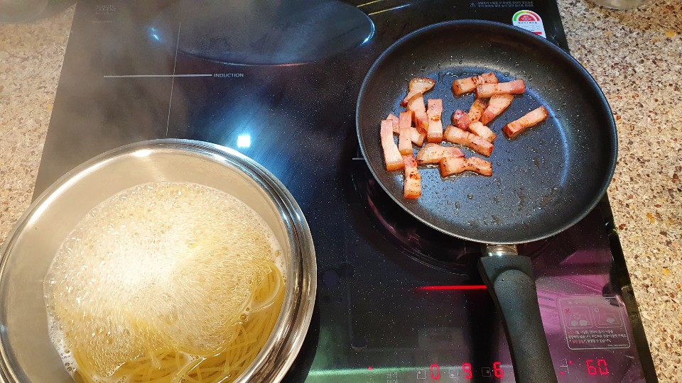 한국 베이컨은 얇게 썰린 경우가 많아서 이탈리안식 베이컨을 까르보나라에 주로 사용했고!