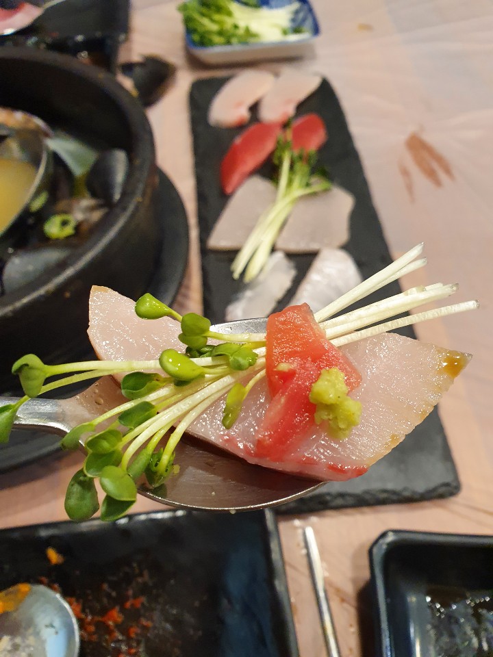 '사장님 설명대로 방어+무순+초생강+고추냉이'를 간장&고추냉이 소스에 콕 찍어서!! 메인 요리 나오면 먹는 법이랑 생선 종류 다 설명해주신다!!