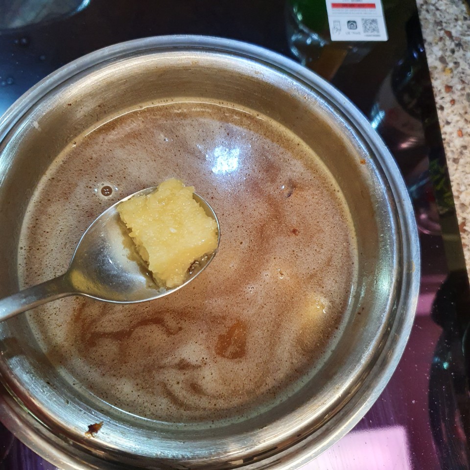 일반 물보다는 어차피 밥 짓는 김에 쌀뜨물로 넣어주는데 뽀오얀 쌀뜨물이 좀 더 꼬수운 맛을 낸다. 사골곰탕 한포 넣어주면 좀 더 좋긴 하지만 집에 지금 없으니 쌀뜨물 고우고우