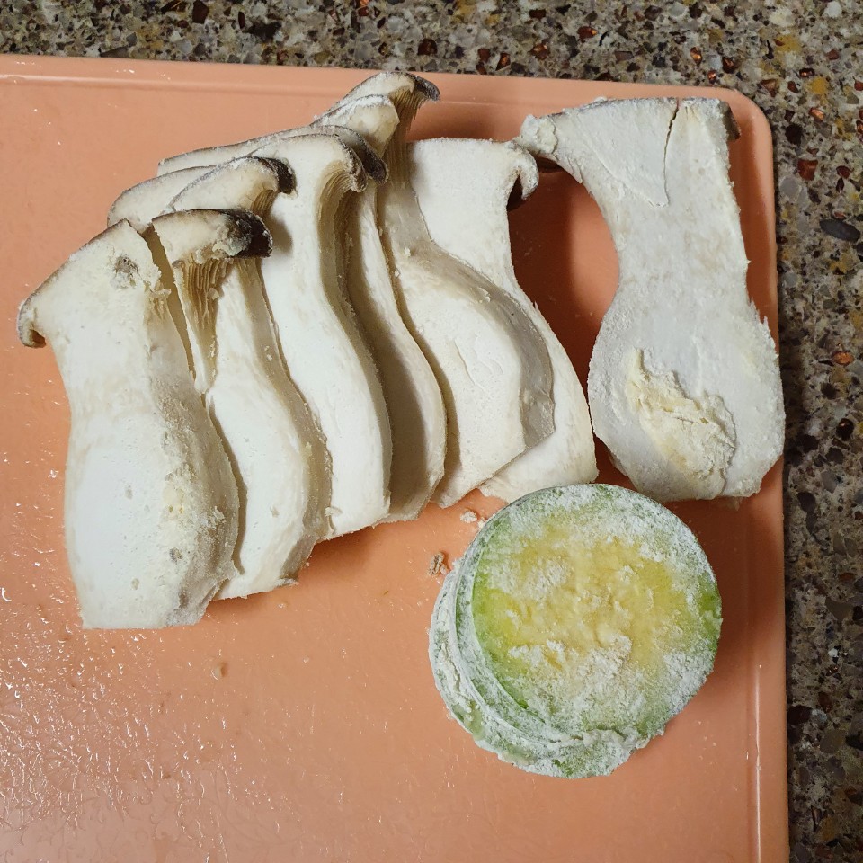 짜란! 새송이 버섯은 편평하게 유지하면서 잘라주는 게 좋을 것 같다. 좀 두꺼운 부분은 아예 부침가루 옷이 안 입혀진다.
