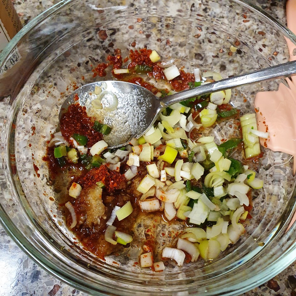 양념장 만들어주고 혹시 나물이랑 양이 적절하지 않을 수 있으니 조금씩 나물을 넣어주면서 섞어주는 게 좋더라! 간장 2큰술, 식초 1큰술, 설탕 1큰술, 고춧가루 1큰술, 마늘 1 큐브, 청양고추 1개 다진 것, 파 한 뼘 다진 것 넣고 섞어주면 양념장 끝!