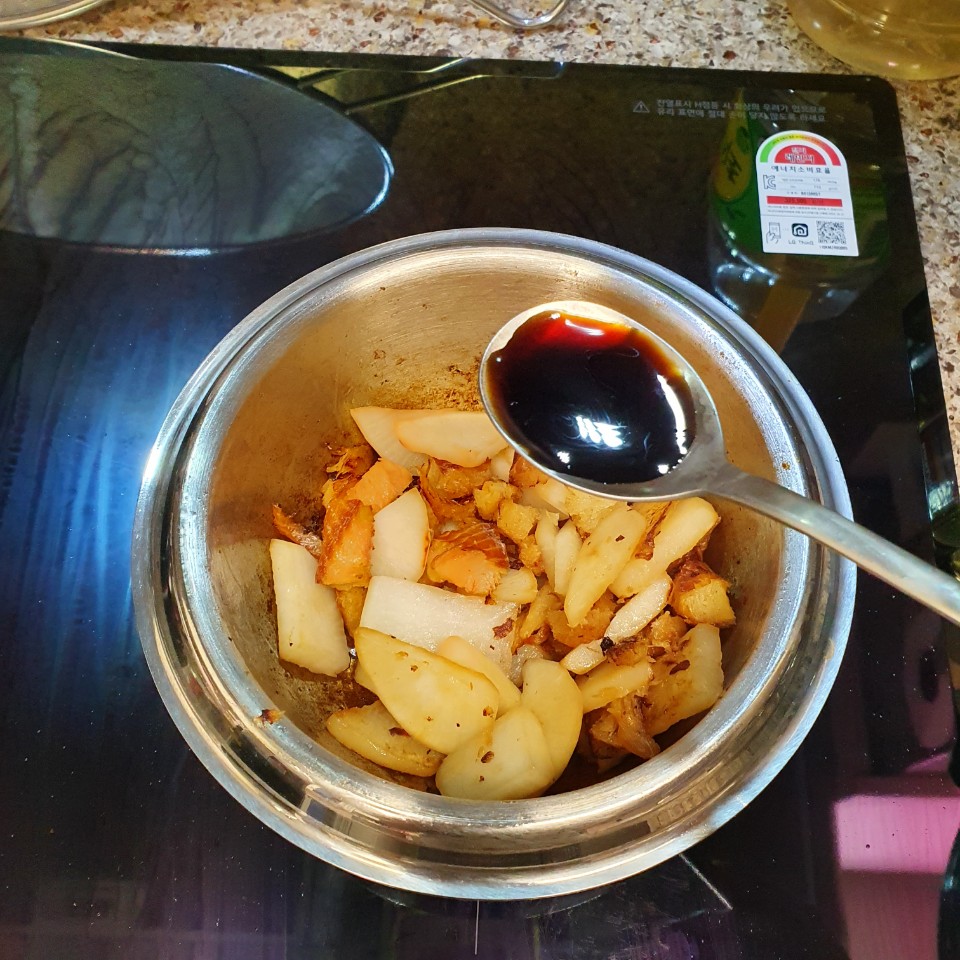 타지 않도록 들기름을 살짝 둘러 주며 볶아준다. 중 약불로 은근하게 무의 반투명한 색깔이 될 때까지 볶아주면서 바닥에 눌어붙지 않도록 조심한다. 난 살짝 탔는데... 끝 맛이 씁쓸할 수 있어서 조심!