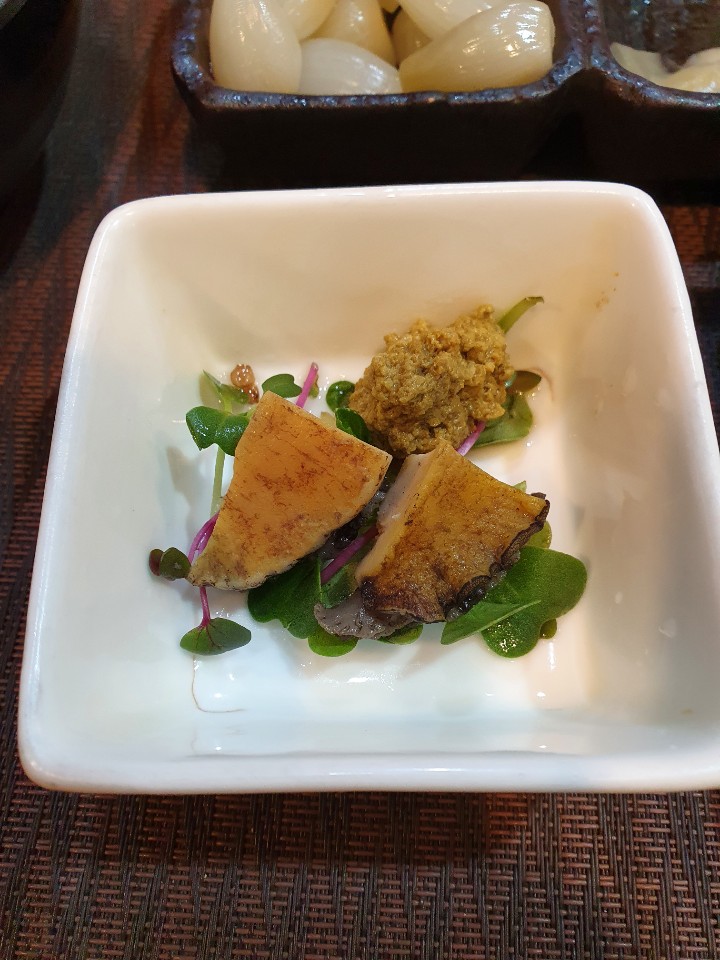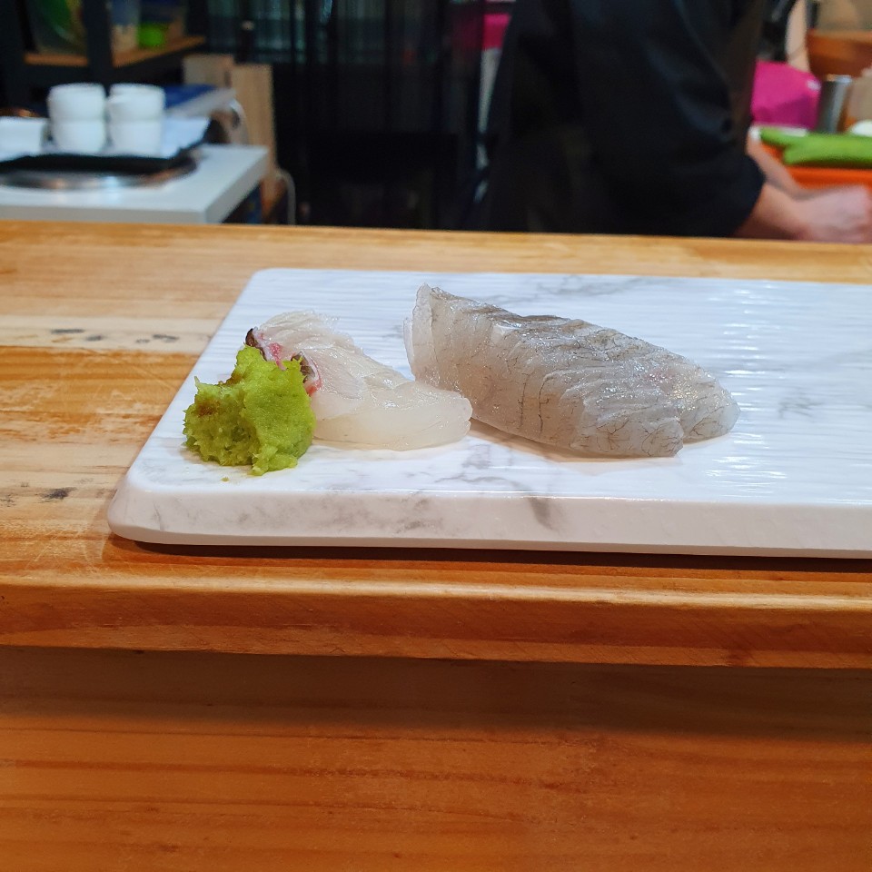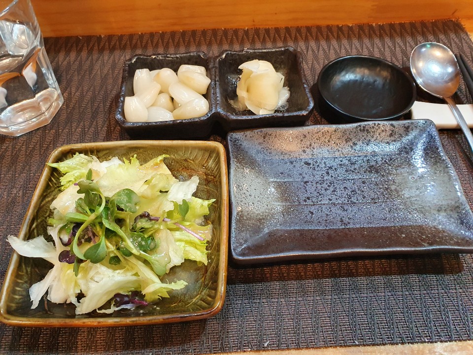오마카세는 8명의 손님이 일행이 아니더라도 함께 시작한다. 세종에서 대전까지 가느라 막히지 않을까 싶었지만 다행히 정각에 도착! 그 바람에 간판 사진 찍을 정신없이 바로 애피타이저 시작이었다ㅋㅋㅋ