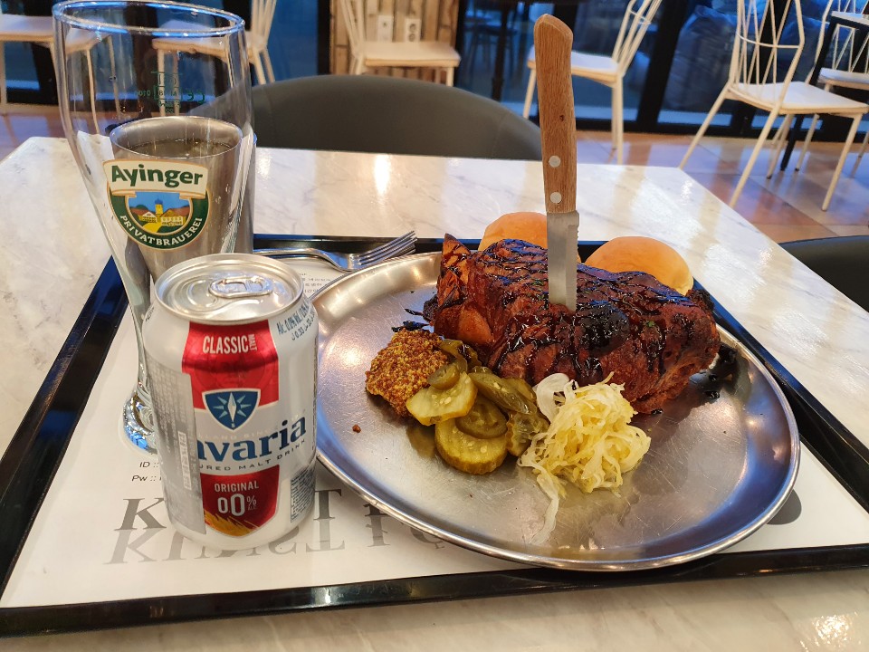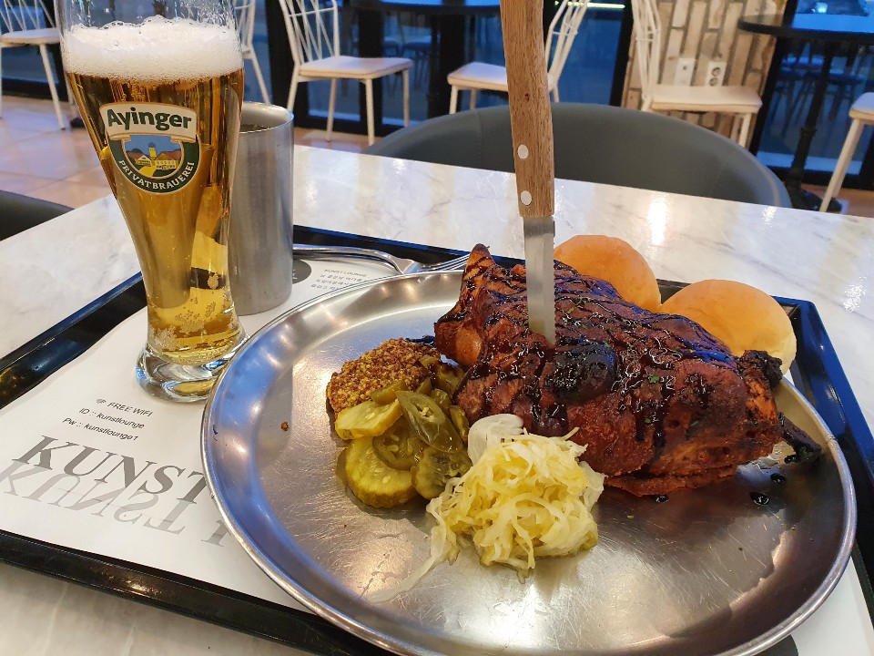 당일치기 여행의 아쉬움은...술을....못마신다는거ㅠ 쿤스트 라운지에서 아잉거 생맥주를 판매하지만 우린 무알콜 캔맥주를 아잉거 잔에 따라 마시면서 분위기를 즐겼다. 토요일 하루 당일치기 여행하면 일요일 아침부터 집에서 늘어지게 쉬어도 좋으니까! 슈바인학셀은 이미 비주얼ㅋㅋㅋㅋ 두 명이서 하나 시켰는데도 배부르게 남았다. 한국식 족발도 좋지만 크리스피하고 바삭한 겉껍질이 자꾸 생각난다.