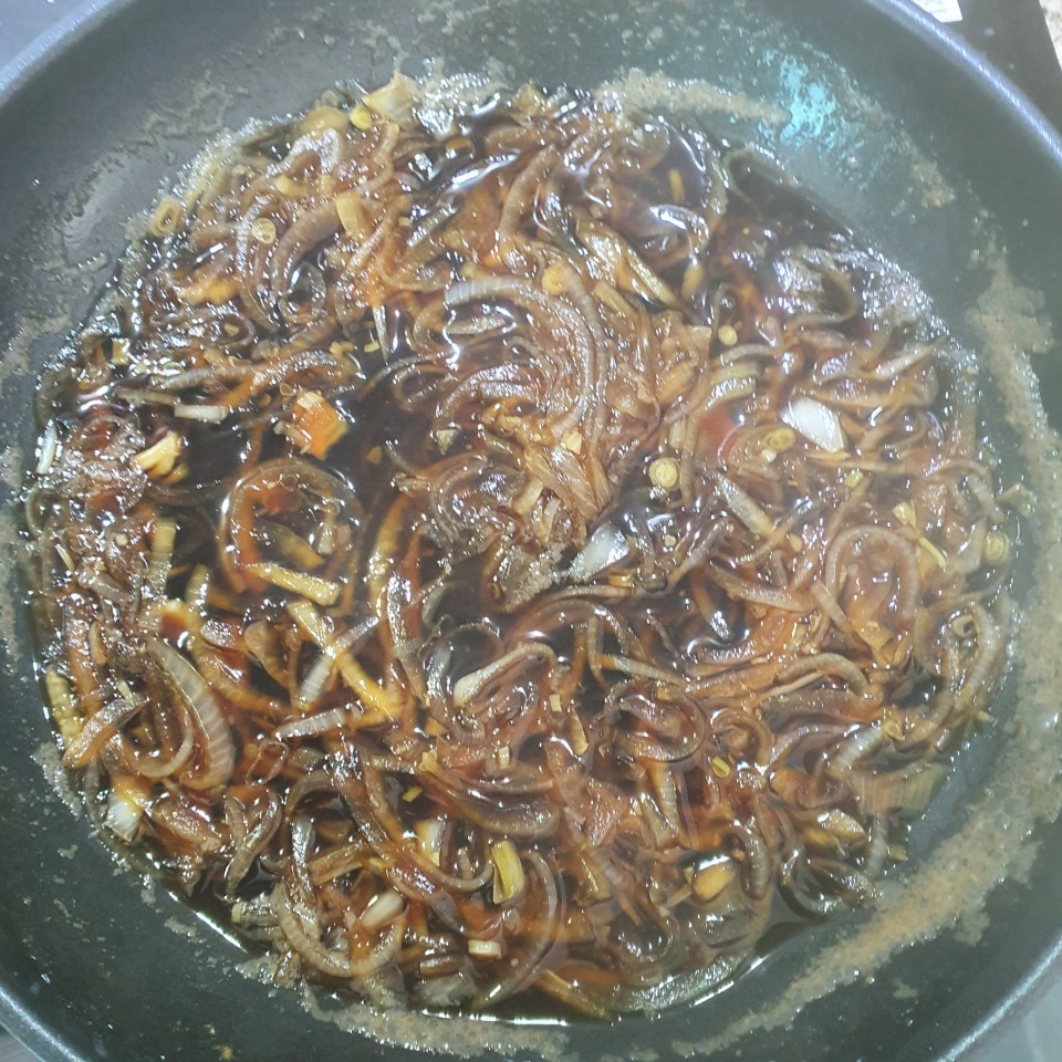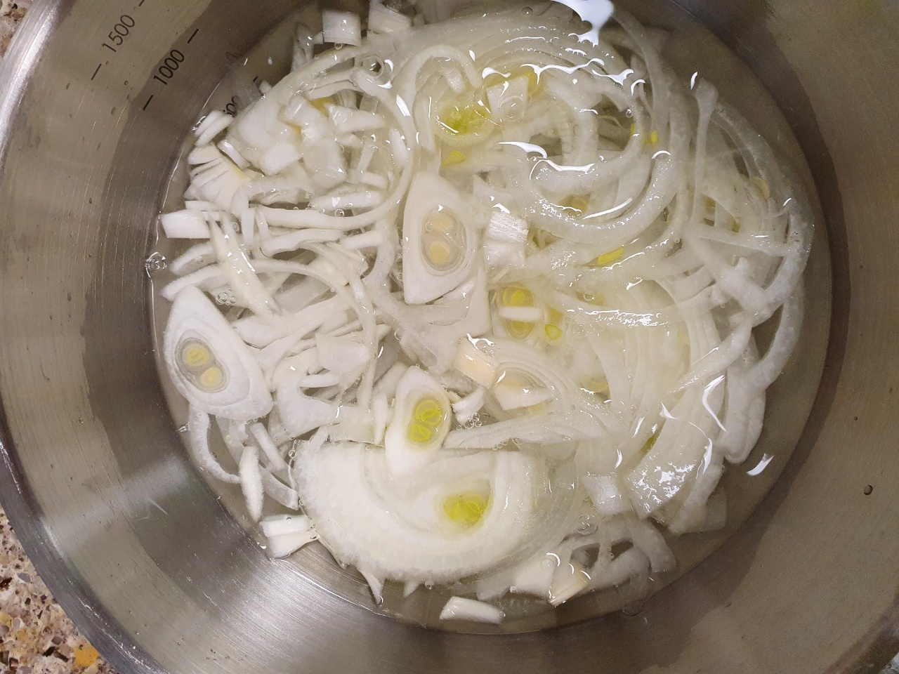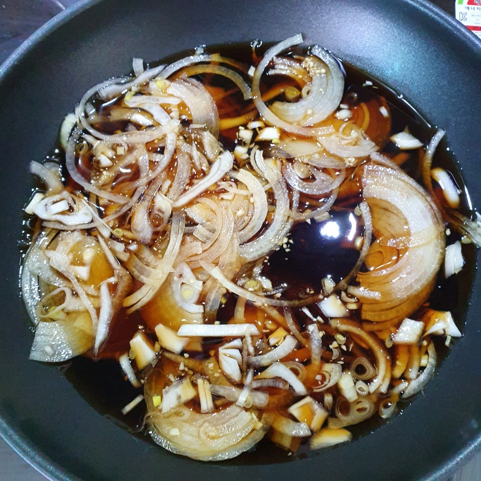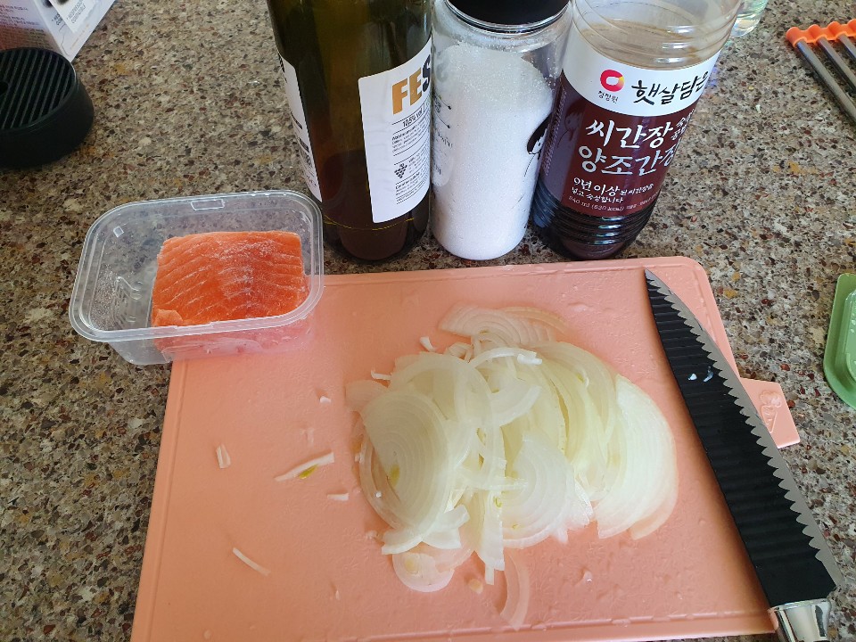 일단 냉동되어 있던 연어는 전날 미리 냉장실에서 해동시키면 좋았을 걸ㅠ 난 그냥 당일에 떠올렸닼ㅋㅋ 어쩔 수 없이 상온에서 해동! 30분 정도 꺼내두었다! 양파는 얇게 다져주고 마늘 1~2개와 함께 '간장:미림:설탕 = 5:3:2'& 약간의 물(눌러 붙지 않게!)을 함께 넣고 끓여주면 소스 완성!(미림대신 화이트와인 썼음! 끓일 때 향이 너무 좋아ㅠ) 난 두고두고 쓰게 양파 1개를 다 넣어서 넉넉하게 만들었다.